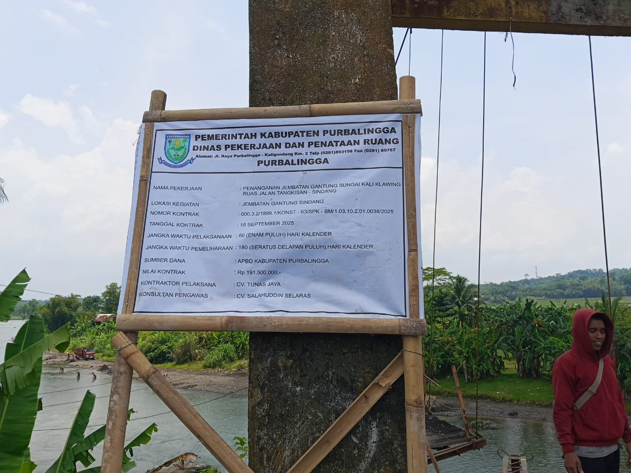 Kami sampaikan bahwa sejak 18 September 2025 telah dimulai pekerjaan penanganan Jembatan Gantung Kali Klawing pada ruas jalan Sindang–Tangkisan dengan nilai kontrak sebesar Rp191.500.000,- dan jangka waktu pelaksanaan 60 hari kalender.